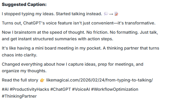 As if that wasn’t enough, it also generated a ready-to-post caption for the article.