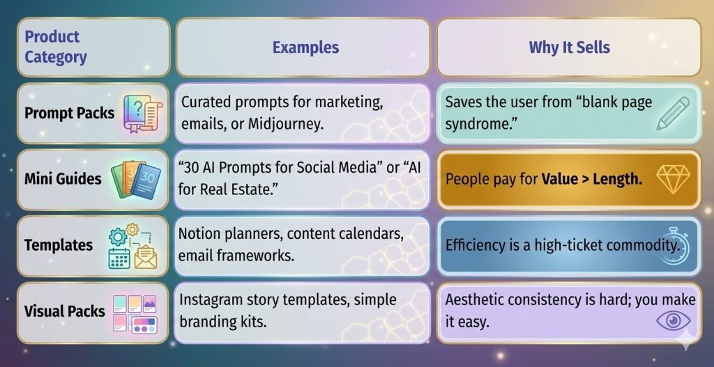 Think: eBooks, prompt packs, Notion templates, mini-guides, checklists, and content bundles.
