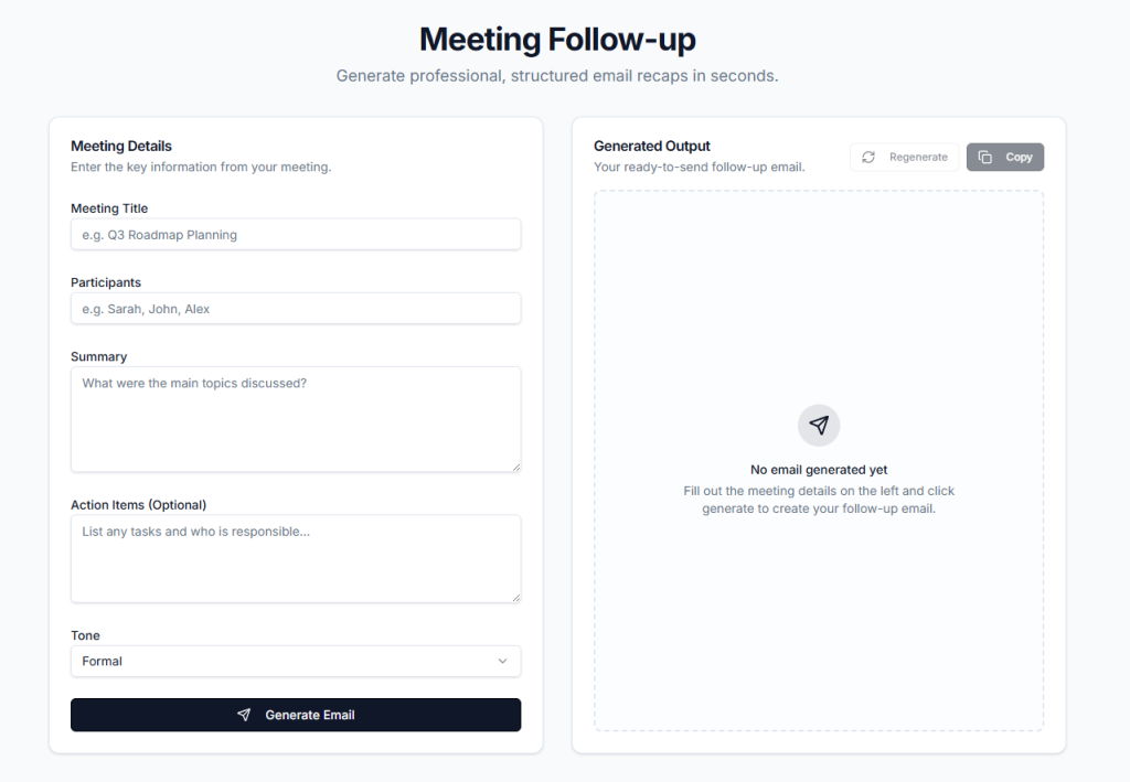 Build a simple full-stack web app using Python (Flask) or Node.js (Express) that generates professional follow-up emails after meetings.