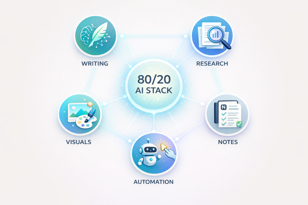 The 80/20 AI Stack is built on a simple premise: Identify the 20% of tools that deliver 80% of your results. Instead of chasing novelty, you build a compact toolkit that covers the core workflows you repeat every single week: Writing, Research, Organization, Visuals, and Automation.
