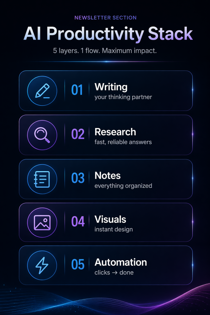 Create a clean, modern infographic for a newsletter section titled “AI Productivity Stack”.